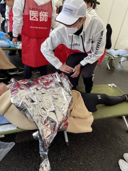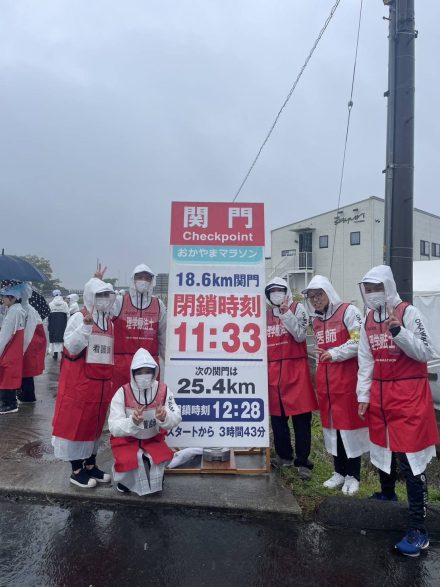 11月9日(日)岡山市内で開催されたおかやまマラソンに救護班として、院長、看護師の町羽、岩城、理学療法士の佐藤、成宮、馬場の6名で参加しました。終始雨模様でランナーにとっては昨年に続き過酷なレースでしたが、少しでも快適に走ってもらえるようサポートを行ってきました。目標達成出来たランナーも惜しくも出来なかったランナーも皆様お疲れ様でした。これからも院内だけでなく院外活動でもスポーツを楽しむ方々をサポートしてまいります。