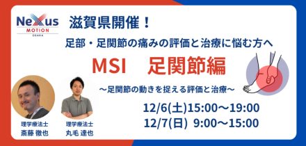 12月6日・7日、滋賀県で開催されたMSI(足関節編)を理学療法士の森岡が受講しました。足部・足関節の痛みに対して、姿勢や動きのクセに着目し、根本原因を評価・修正する「MSI(運動系機能障害)」の考え方と技術を学べるセミナーとなります。患者様が自ら体と向き合いより健康的な生活を過ごして頂けるよう日々研鑽して参ります。
