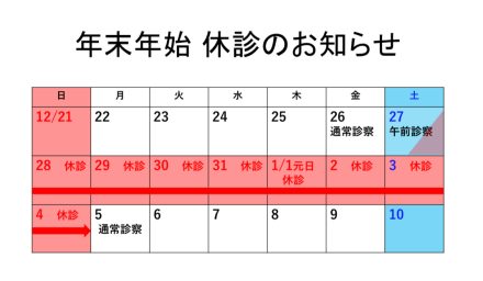 当院の年末年始休診は下記の通りとさせて頂きます。長期間の休みとなりご迷惑をお掛けしますが、何卒宜しくお願い致します。
