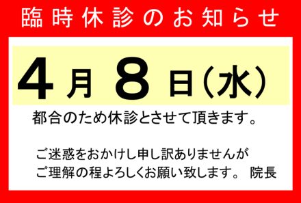 平素より当クリニックをご利用いただき、誠にありがとうございます。このたび、診療体制の見直しに伴い、令和8年4月1日より最終受付時間を変更させていただくことになりました。患者様にはご不便をおかけいたしますが、今後も安心して受診していただける医療提供に努めてまいります。ご理解、ご協力のほどよろしくお願いいたします。